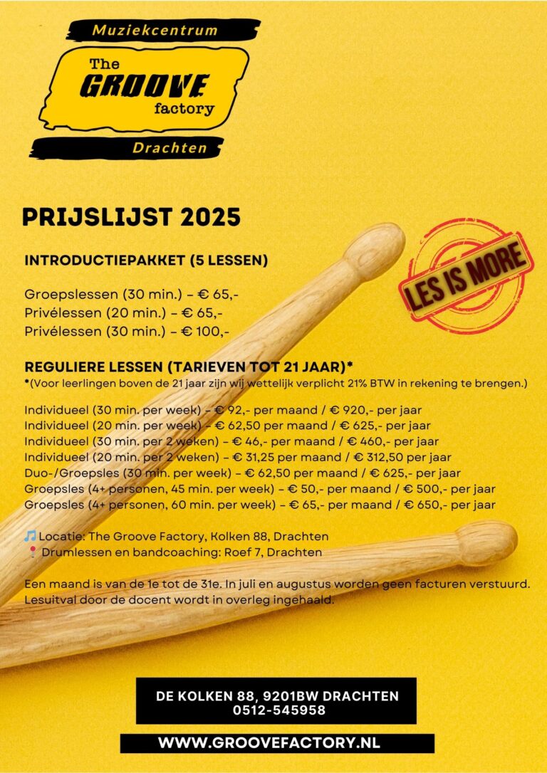 Onze muzieklessen worden gegeven in The Groove Factory. De drumlessen en bandcoaching vinden plaats aan de Roef 7 in Drachten.
